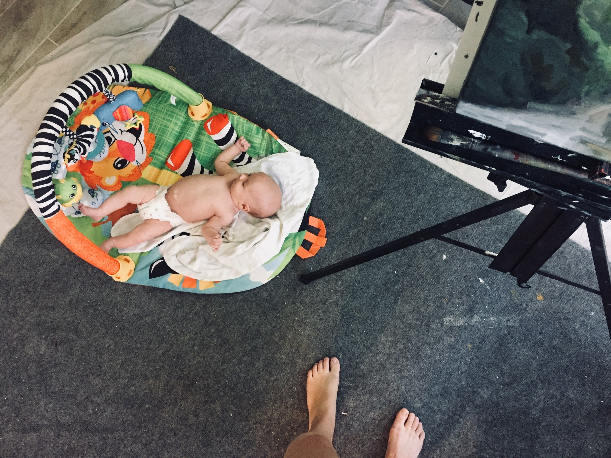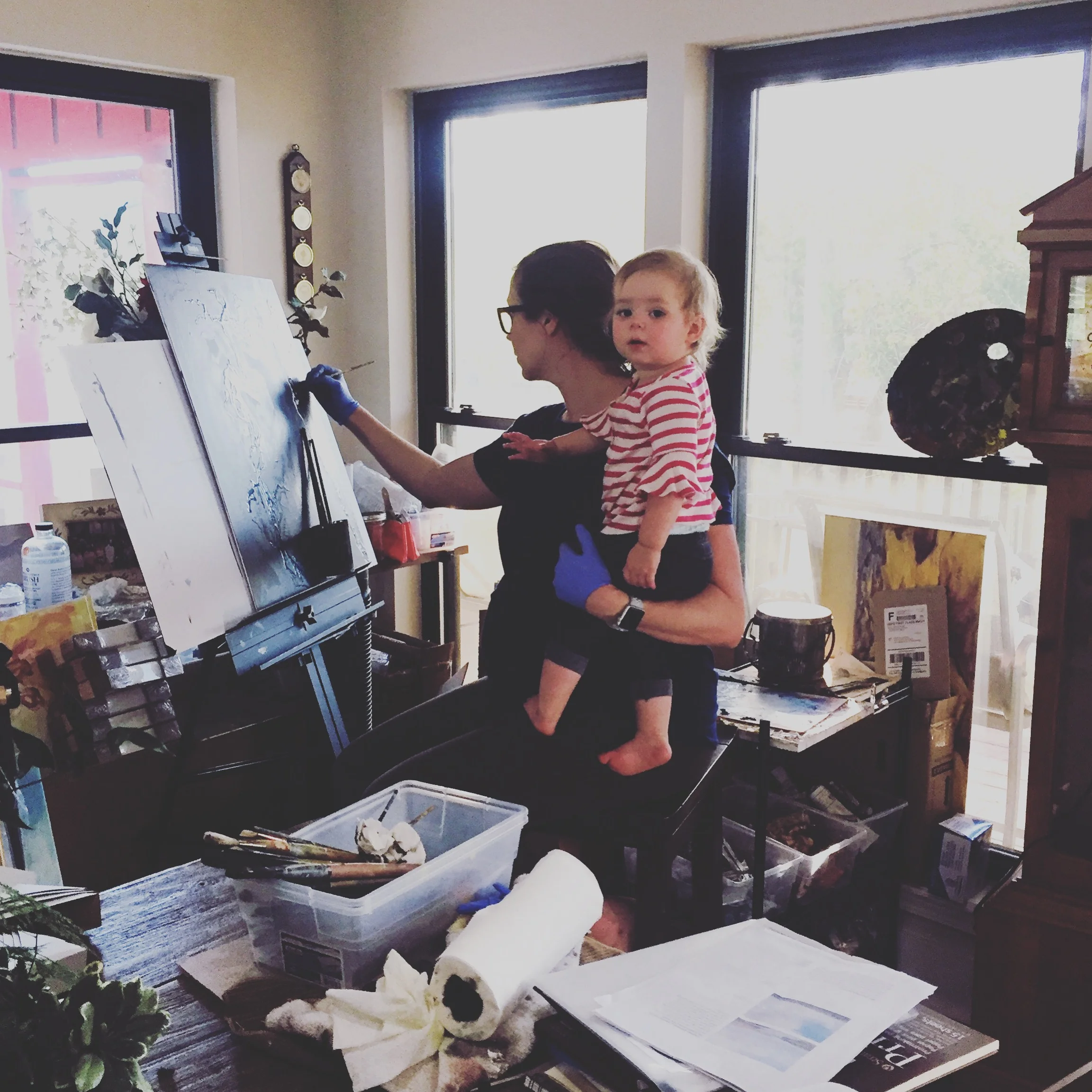 I also utilize time away from the studio efficiently when preparing to paint. If I have 5-10 minutes of happy kids, I may just set out the paints I know I'll need for later that day (or week...). I try to batch my work, and prep all my canvasses in one day so they are ready to go and have a consistent block in. Recently, I use nursing to catalogue ideas and inspiration references, and even try to *think* out my approach in my head before I'm standing in front of the easel (this doesn't always work, but sometimes does.)