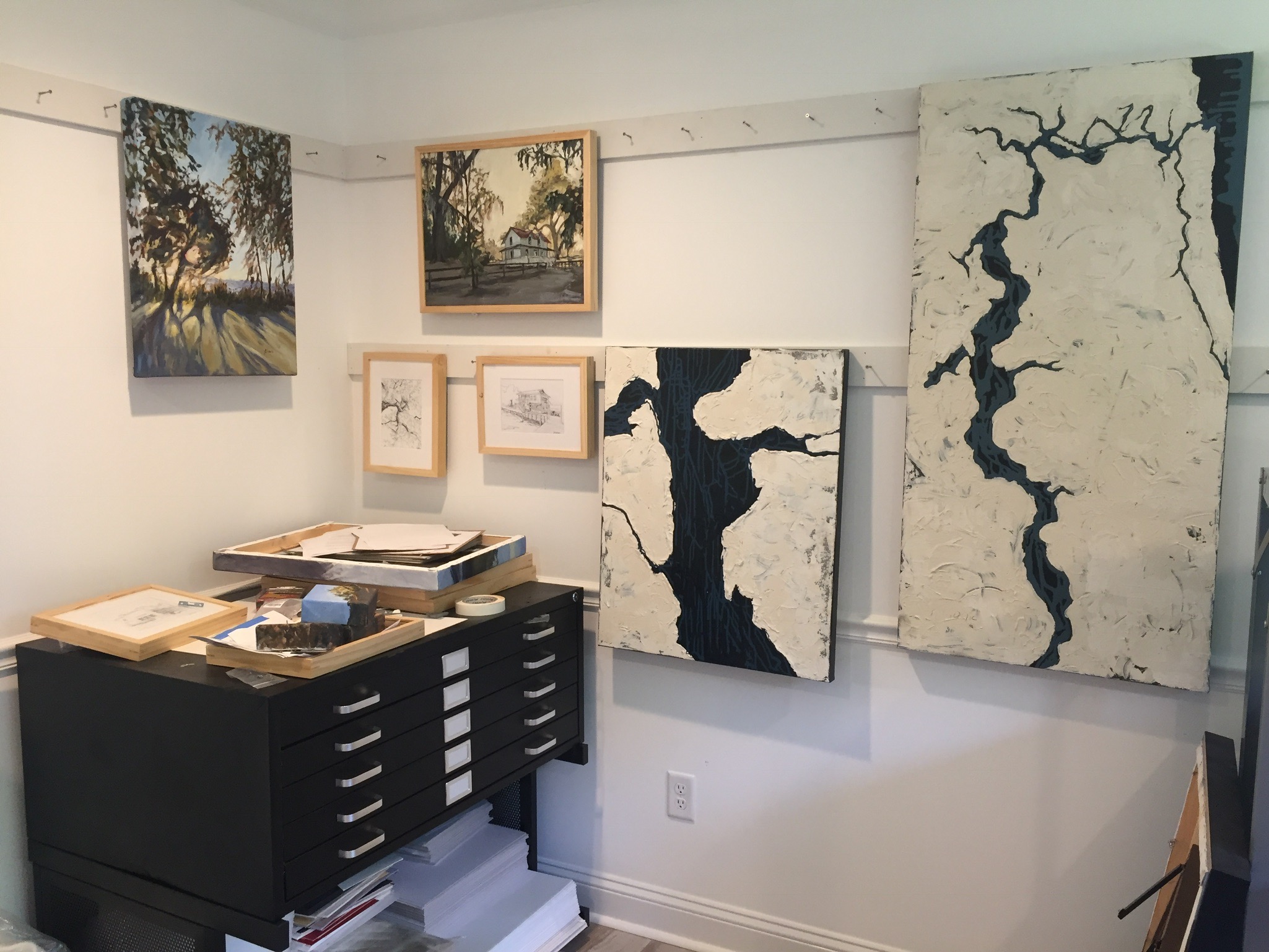 I used to utilize the time my husband was at sea to paint. Or, keep a sketchbook on the ship! Now, having a functional space I can lock and leaving everything out is imperative when I may need to drop everything quickly to tend to a baby.
