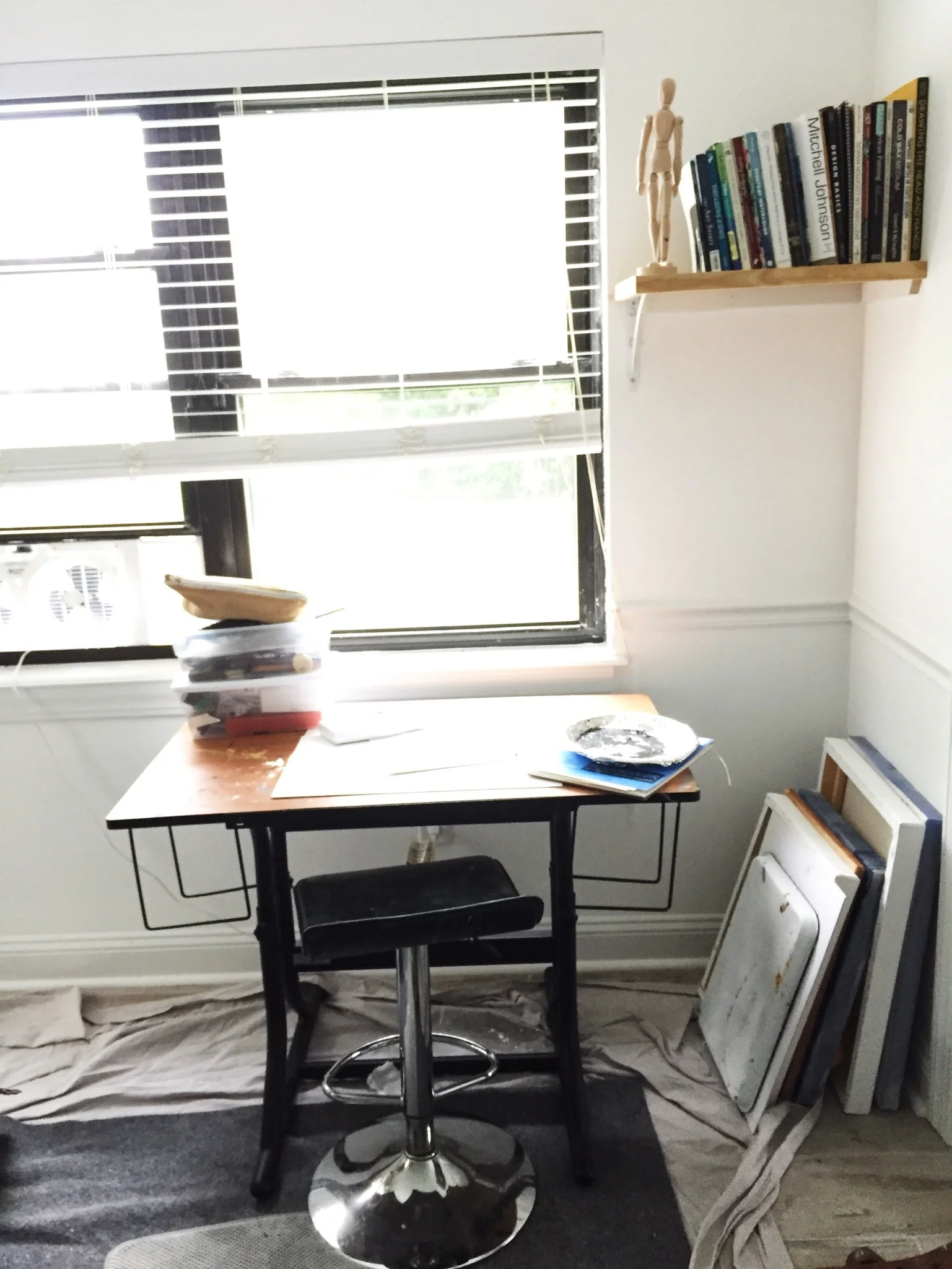 And finally, for the water colors and small work, I love my Craigslist (also salvaged from the flood) drafting table. Simple. to the point, a bit loved in after so many years as doubling as paint storage.