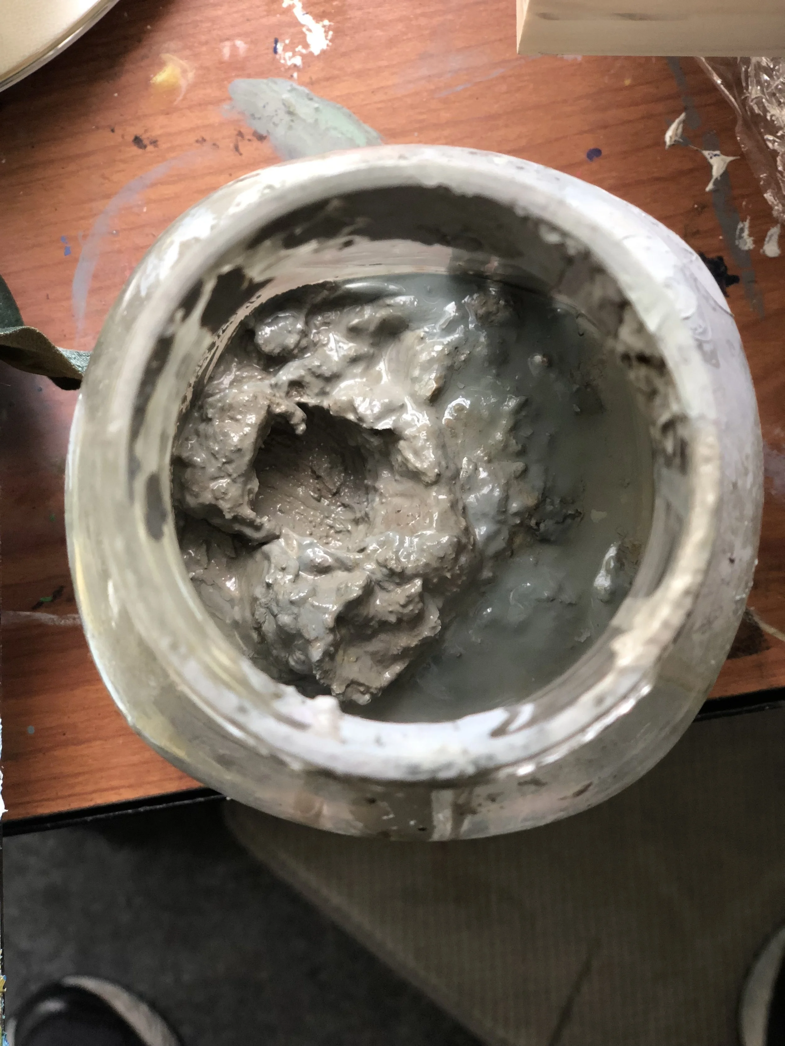5. What’s left is the myriad of paint you have been using. I think Gamblin colors calls this “torrit gray.” DONT WASTE IT! The solvent will continue to separate from the pigment. Keep pouring the solvent back and eventually the pigment will get harder. You can use it! Add oil or more solvent to tint canvasses or use as a gray!